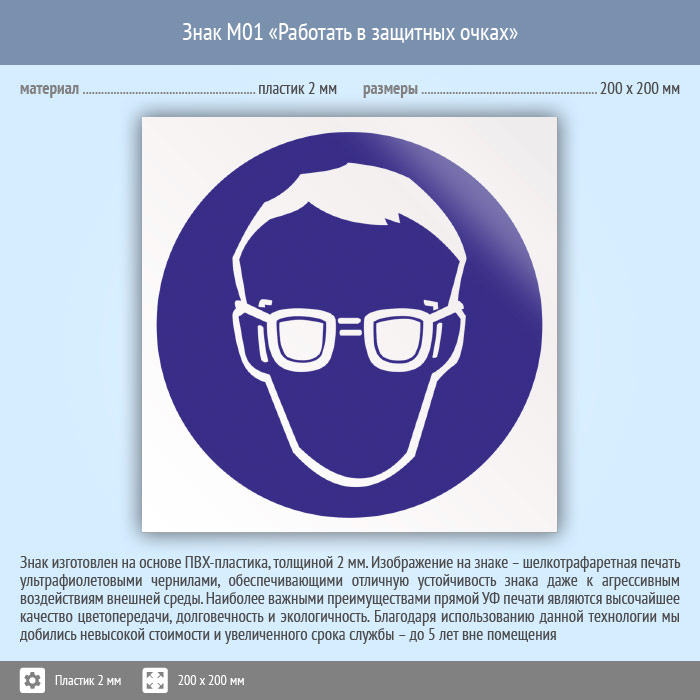 Знак M01 «Работать в защитных очках» (пластик, 200х200 мм) в Ноябрьске купить