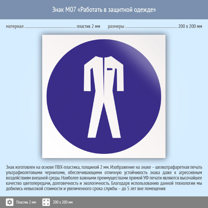 Знак M07 «Работать в защитной одежде» (пластик, 200х200 мм) в Ноябрьске купить