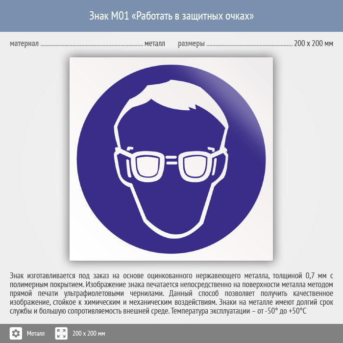 Знак M01 «Работать в защитных очках» (металл, 200х200 мм) в Ноябрьске купить