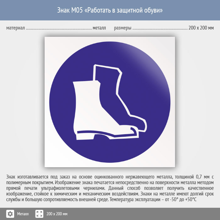 Знак M05 «Работать в защитной обуви» (металл, 200х200 мм) в Ноябрьске купить