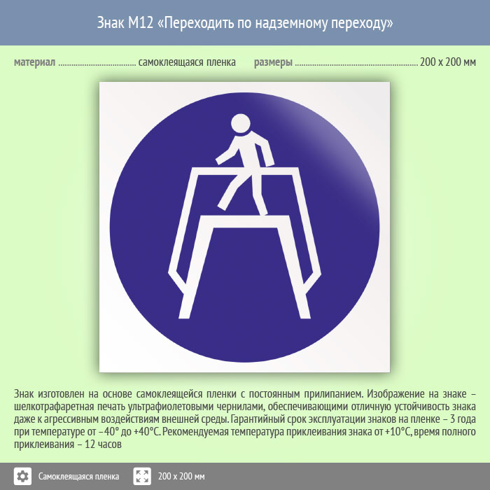 Знак «Переходить по надземному переходу» может быть изготовлен любого размера на самоклеящейся пленке, пластике толщиной 0.5, 2 или 4 мм и металле. Также возможно применение фотолюминесцентных и световозвращающих материалов